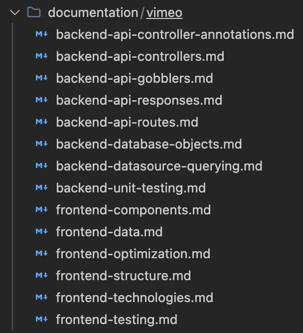 The documentation was stored statically on the server itself as markdown files, organized in a documents/ folder by <code-repository>/<the-discipline>.md - for example, vimeo/frontend-testing.md and vimeo/backend-api-controllers.md.